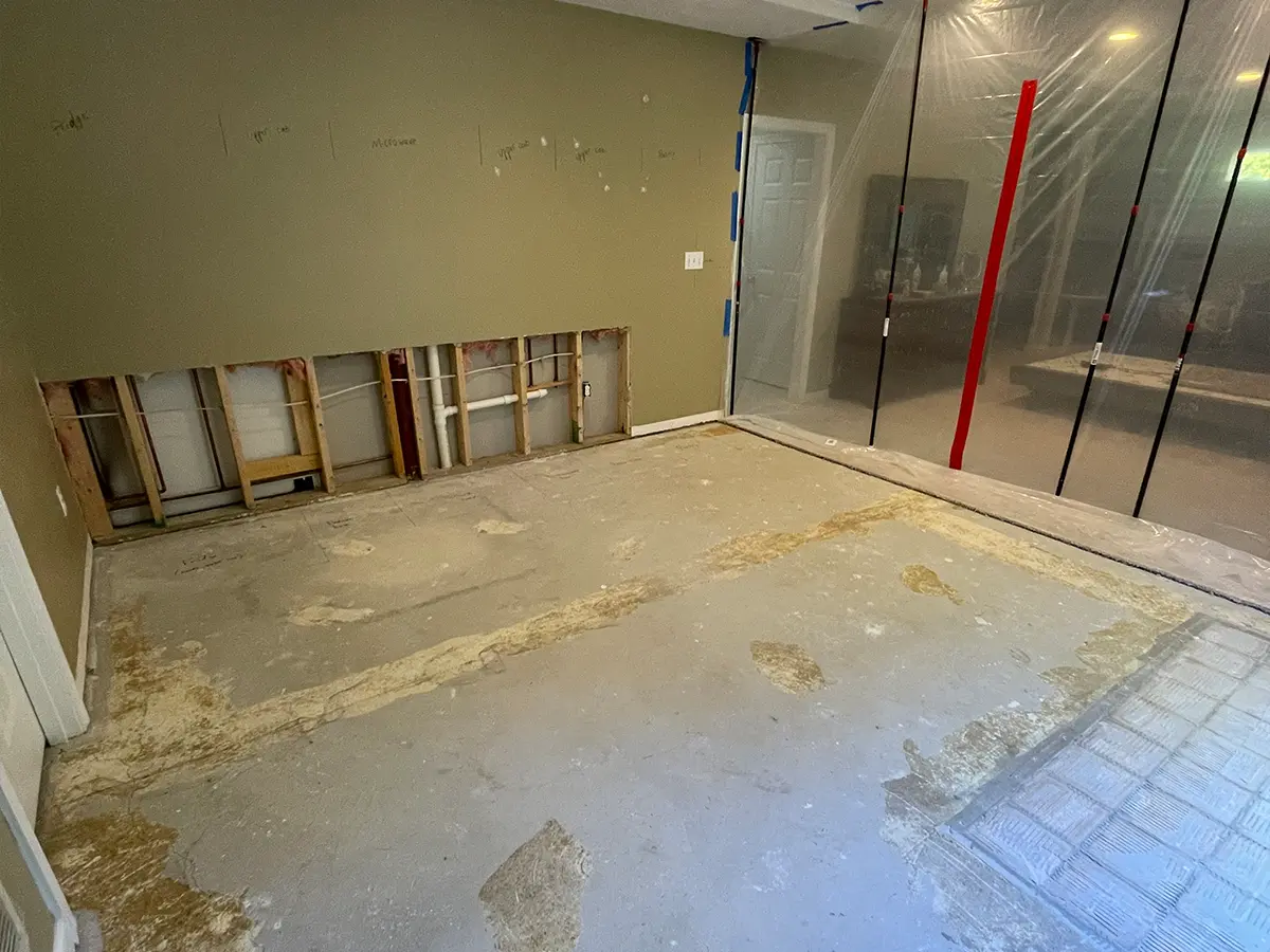 - Luxury vinyl flooring installed under cabinetry